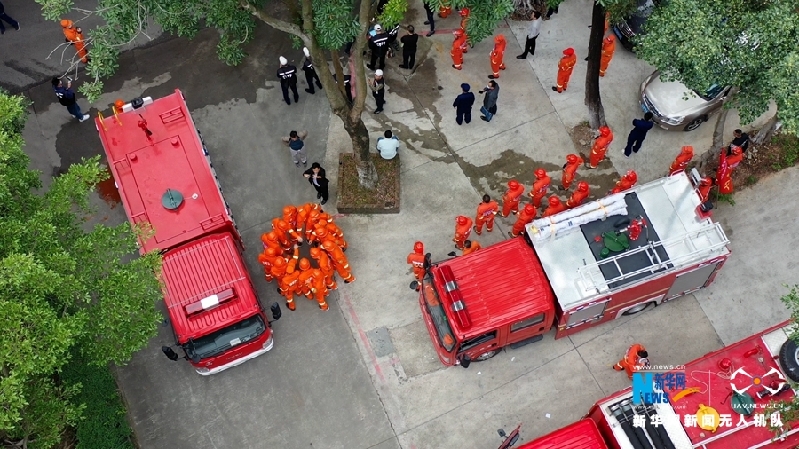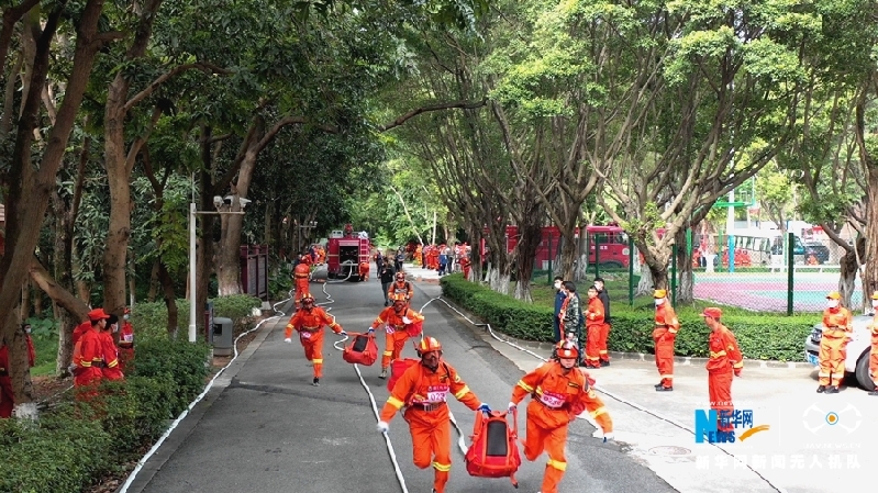 航拍泵車(chē)結(jié)合以水滅火比賽。新華網(wǎng)發(fā)