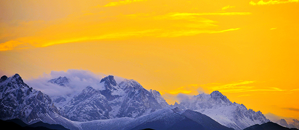馬牙雪山因形似馬牙而得名。藏語(yǔ)稱其為阿尼嘎卓,位于甘肅省武威市天??h(白牦牛主產(chǎn)地)西部,主峰白尕達(dá),藏語(yǔ)稱倫布什則,意為最高的須彌山。其實(shí),它還不能算一座真正的終年雪山,只是因?yàn)樗膸r石表面顏色多呈白色,遠(yuǎn)看像雪,故此稱為雪山。一天當(dāng)中氣候也會(huì)多變,時(shí)而風(fēng)和日麗,時(shí)而風(fēng)起云涌、電閃雷鳴、疾風(fēng)暴雨。是日,瓢潑大雨兩個(gè)時(shí)辰后,雨驟停,又等候兩個(gè)時(shí)辰,晚霞出。