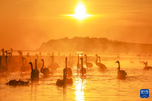 冬日清晨,在山東省榮成市成山鎮(zhèn)天鵝湖,大天鵝在晨曦中游弋、漫步、覓食,構(gòu)成一幅和諧的生態(tài)畫卷。新華社發(fā)(李信君攝)pagebreak