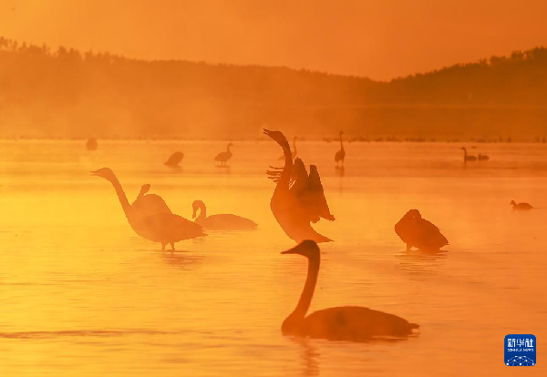 冬日清晨,山東榮成大天鵝國家級自然保護區(qū)晨霧裊裊,大天鵝在晨曦中游弋覓食、起舞飛翔,吸引眾多游客前來觀賞拍照。新華社發(fā)(李信君攝)