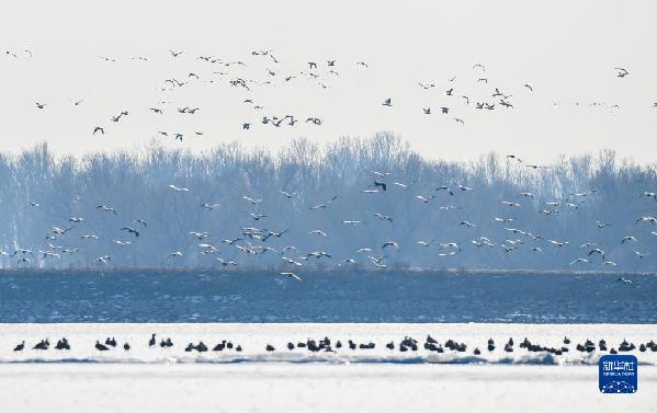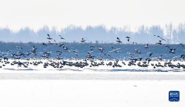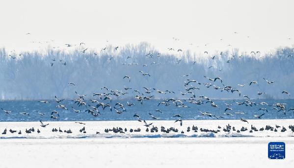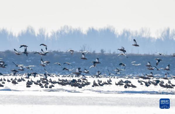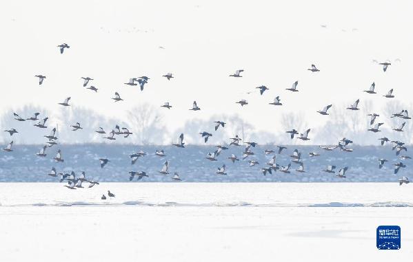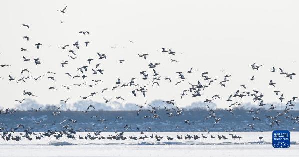 正值冬日,在呼和浩特土默特左旗海流水庫,四五千只赤麻鴨棲息在此,為海流水庫增添了勃勃生機(jī)。
