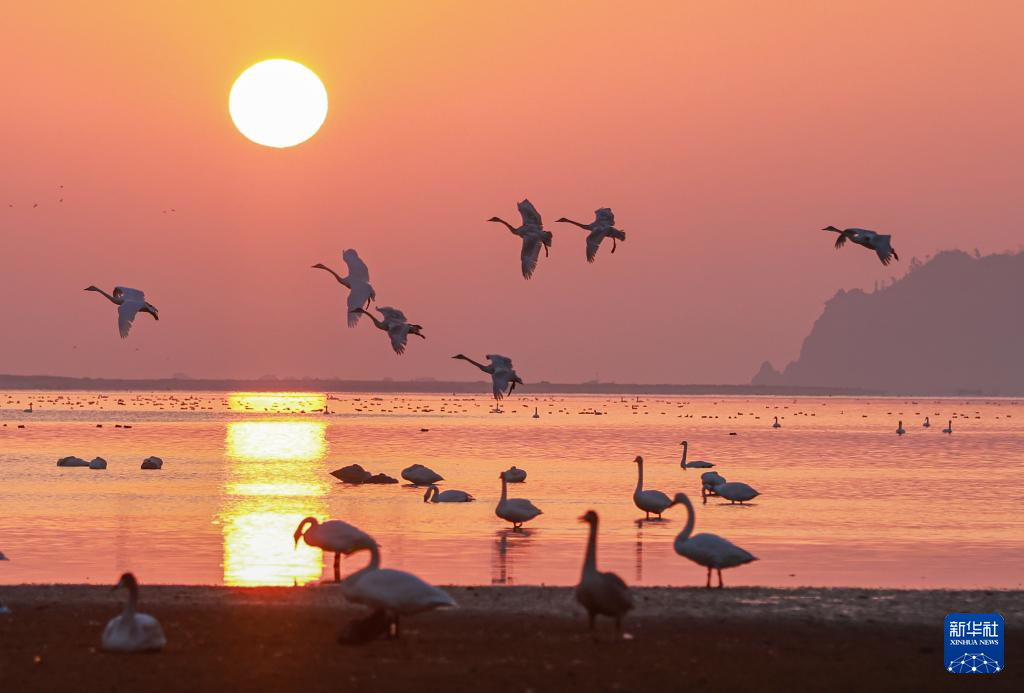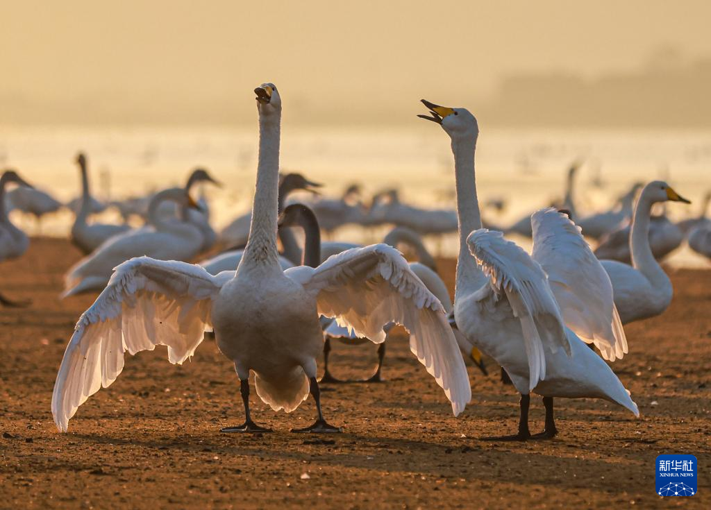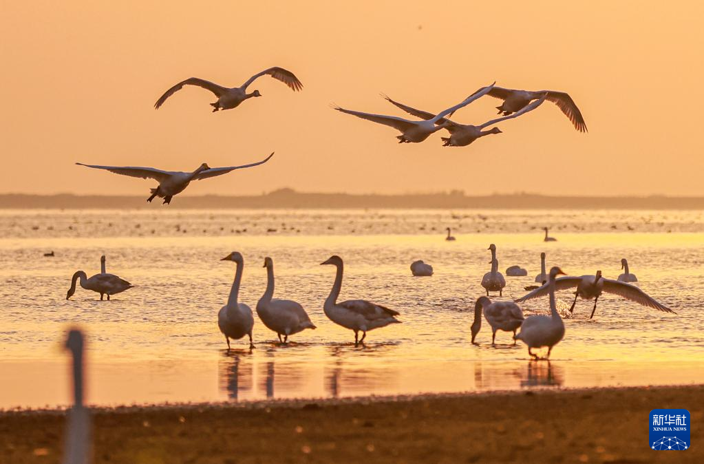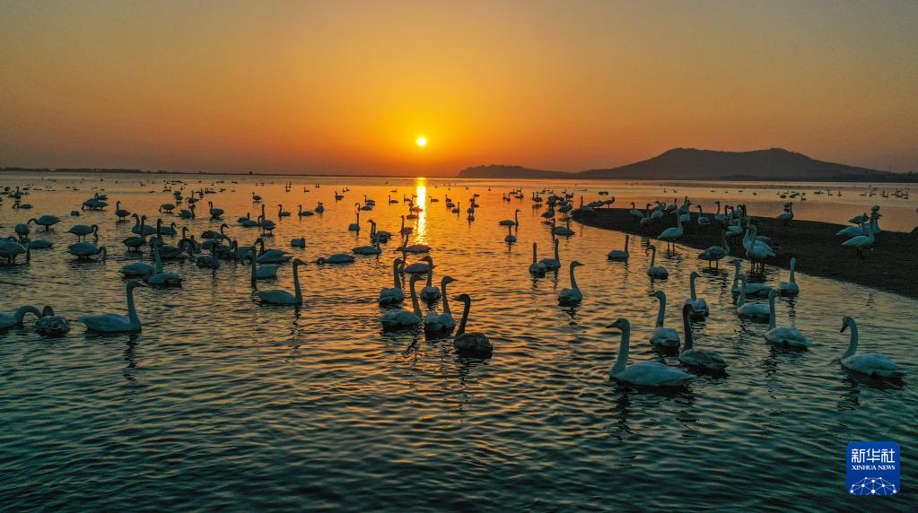 冬日清晨,在山東省榮成市成山鎮(zhèn)天鵝湖,大天鵝在晨曦中游弋、漫步、覓食,構(gòu)成一幅和諧的生態(tài)畫卷。新華社發(fā)(李信君攝)