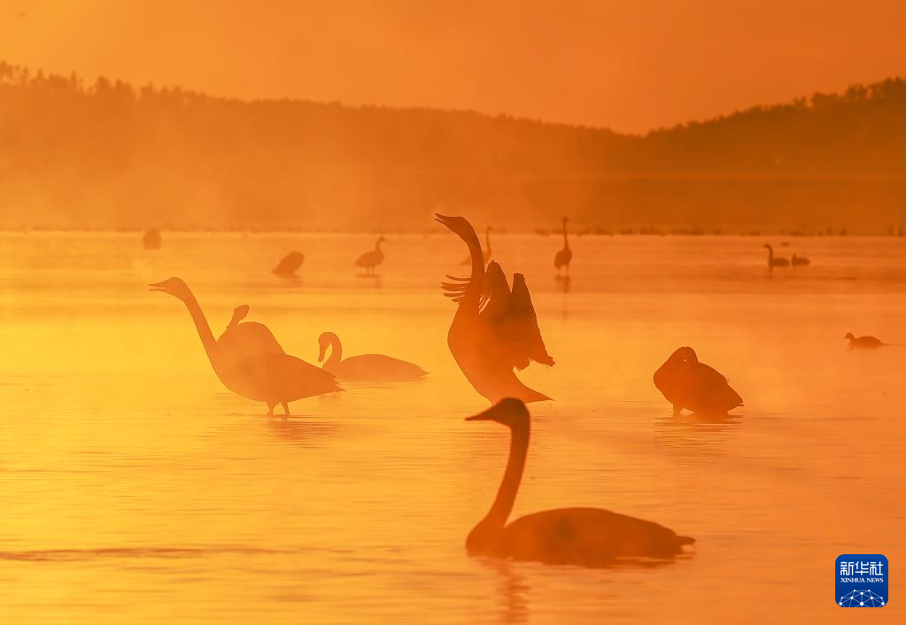 冬日清晨,山東榮成大天鵝國家級自然保護(hù)區(qū)晨霧裊裊,大天鵝在晨曦中游弋覓食、起舞飛翔,吸引眾多游客前來觀賞拍照。新華社發(fā)(李信君攝)