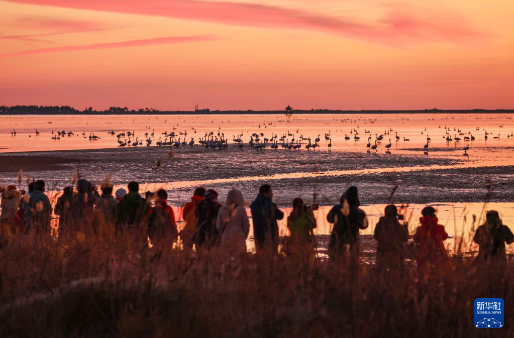 11月28日,在山東省榮成市大天鵝國家級自然保護(hù)區(qū)的一處湖畔,市民和攝影愛好者在觀賞大天鵝。