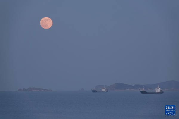 12月19日在山東省煙臺市蓬萊區(qū)海濱拍攝的滿月。
