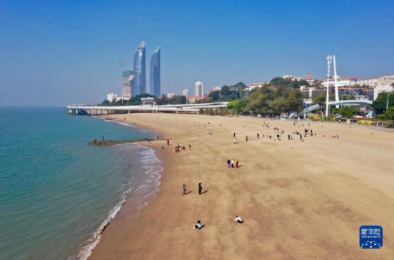 游客在廈門(mén)大學(xué)附近的白城沙灘游玩(12月12日攝,無(wú)人機(jī)照片)。