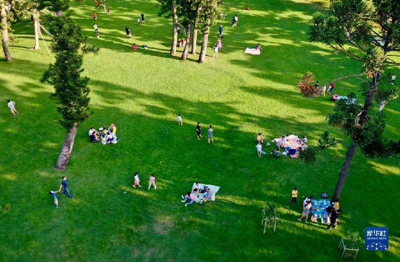 游人在廈門(mén)園林植物園草坪上享受休閑時(shí)光(10月5日攝,無(wú)人機(jī)照片)。