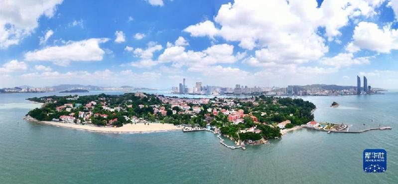 廈門(mén)鼓浪嶼景區(qū)及遠(yuǎn)處廈門(mén)鷺江道一帶城市建筑(10月6日攝,無(wú)人機(jī)照片)。