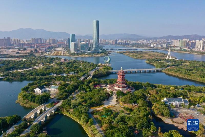 廈門(mén)園林博覽苑與遠(yuǎn)處的集美新城一帶城市景觀(12月8日攝,無(wú)人機(jī)照片)。