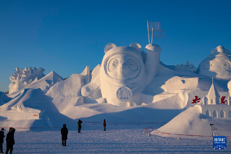 1月2日,在太陽島雪博會園區(qū),游客在雪雕前游覽。