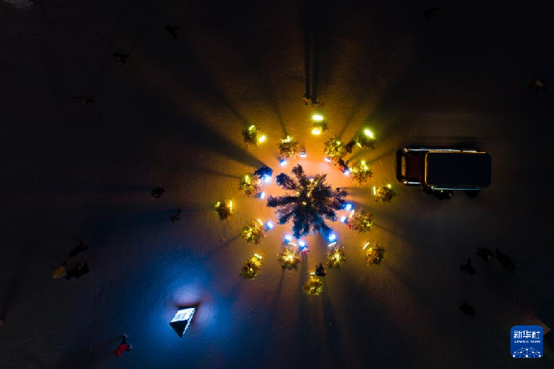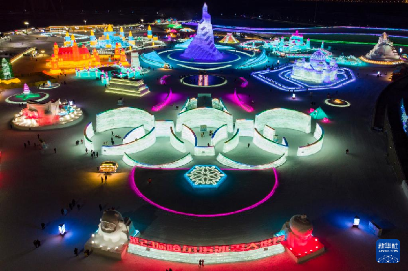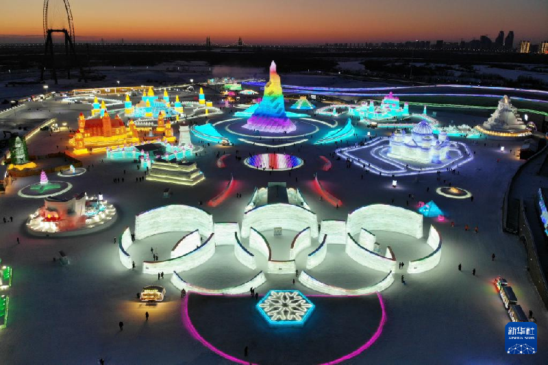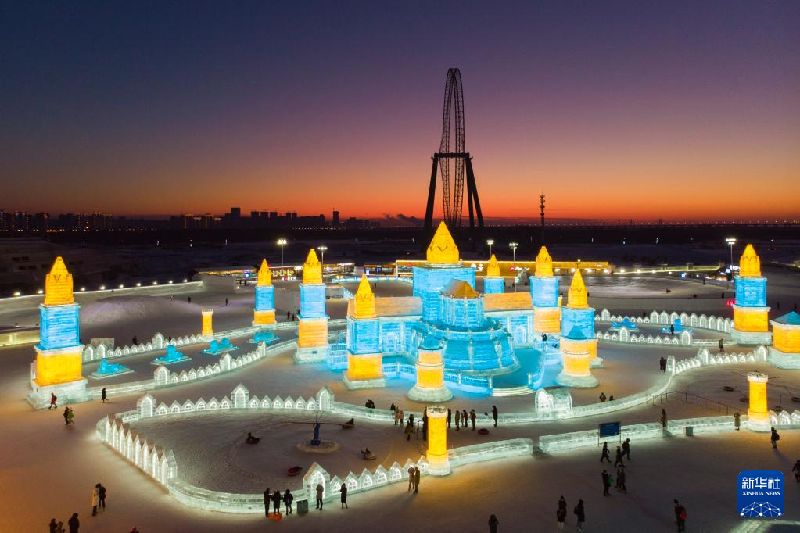 1月2日,游客在哈爾濱冰雪大世界園區(qū)游玩(無人機照片)。