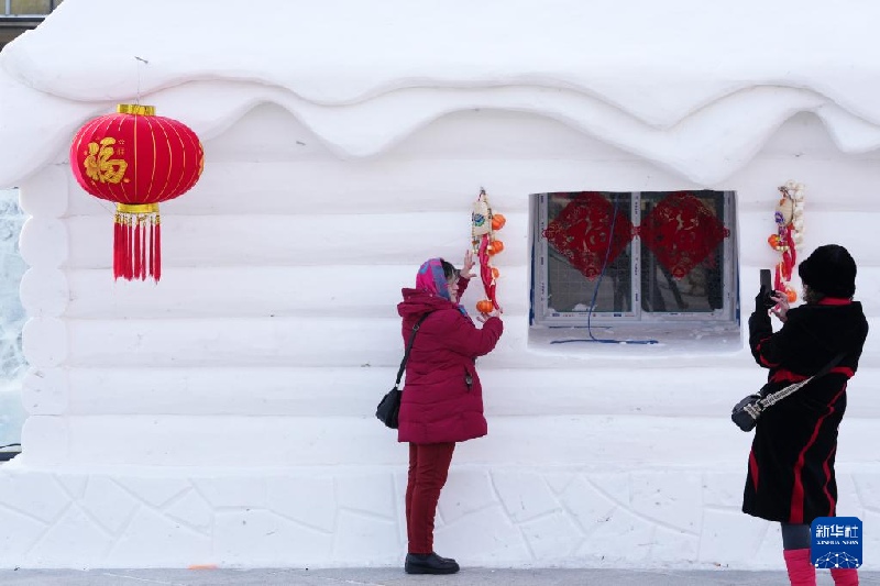 1月1日,在哈爾濱防洪紀念塔廣場,人們在雪屋前拍照。