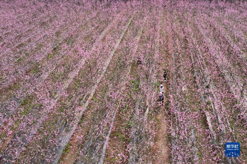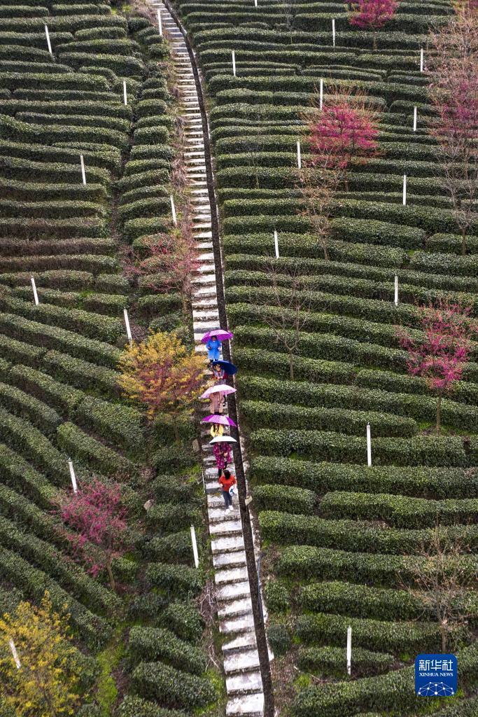 3月10日,游人在湖北省宜昌市秭歸縣九畹溪鎮(zhèn)界埡村的茶園里踏青賞花(無(wú)人機(jī)照片)。