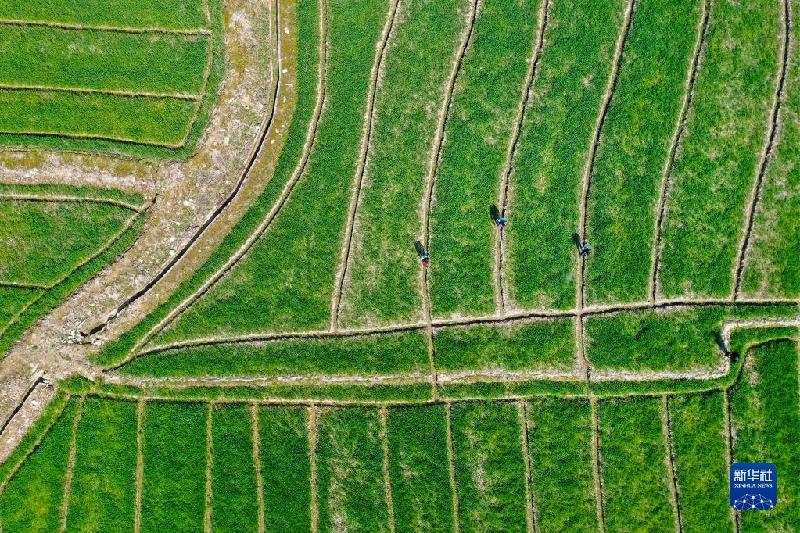 3月9日,浙江省寧波市鄞州區(qū)東吳鎮(zhèn)天童村村民在田間管護(hù)農(nóng)作物(無(wú)人機(jī)照片)。