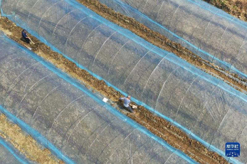 3月9日,貴州省岑鞏縣思旸鎮(zhèn)磨寨村村民在搭建西瓜大棚(無(wú)人機(jī)照片)。