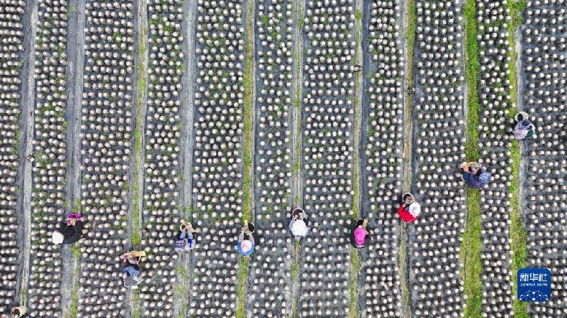 3月9日,村民在貴州省冊(cè)亨縣秧壩鎮(zhèn)者術(shù)村木耳種植示范基地采收木耳(無(wú)人機(jī)照片)。
