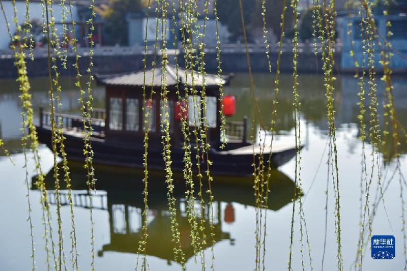 3月9日在江蘇南通如皋市水繪園風(fēng)景區(qū)拍攝的吐出嫩芽的垂柳。