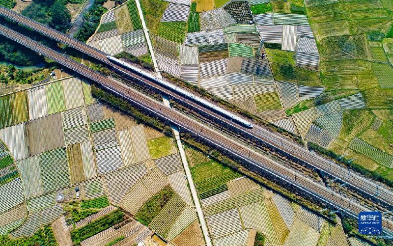 3月9日,一列動(dòng)車組列車穿行在廣西南寧市興寧區(qū)五塘鎮(zhèn)田園(無(wú)人機(jī)照片)。