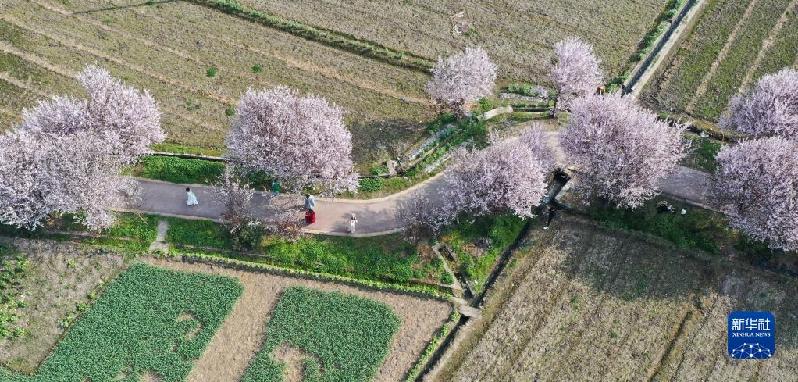 3月10日,游人在四川成都彭州市丹景山鎮(zhèn)武備村的綠道上游玩賞花(無(wú)人機(jī)照片)。