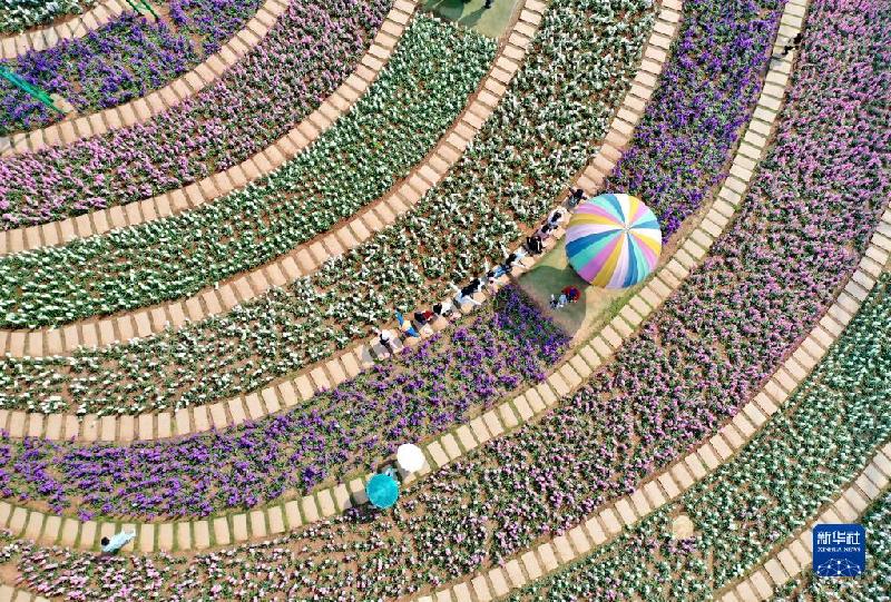 3月10日,游客在成都市新都區(qū)漫花莊園賞花(無(wú)人機(jī)照片)。