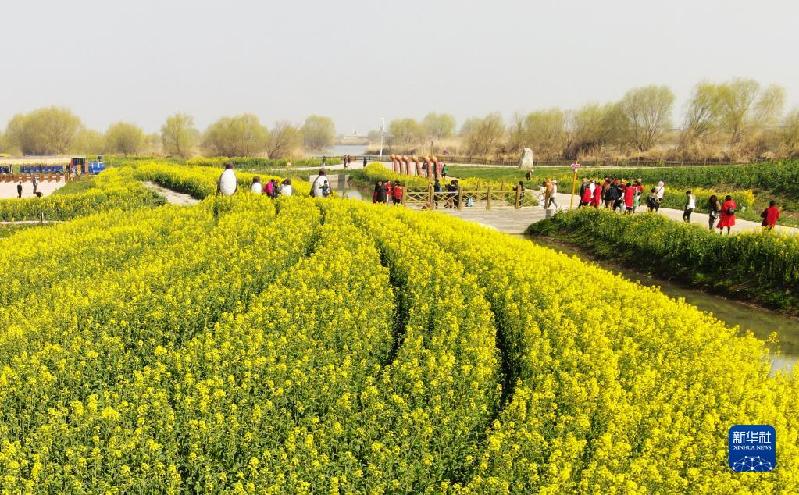 3月10日,游客在江蘇省高郵市湖上花海景區(qū)賞花游覽(無(wú)人機(jī)照片)。