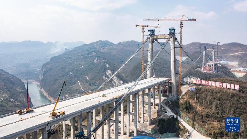 建設(shè)中的貴金古高速金烽烏江大橋(3月9日攝,無人機(jī)照片)。