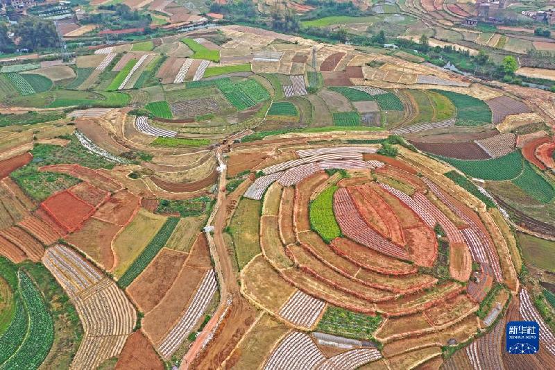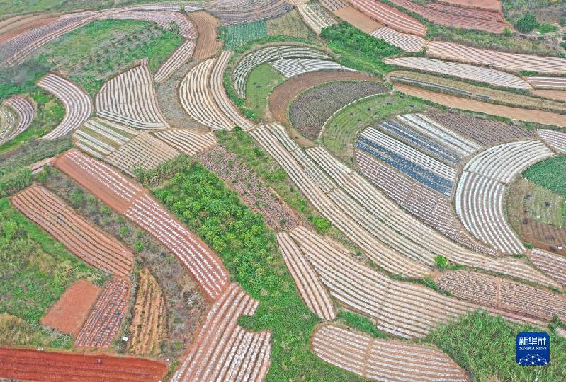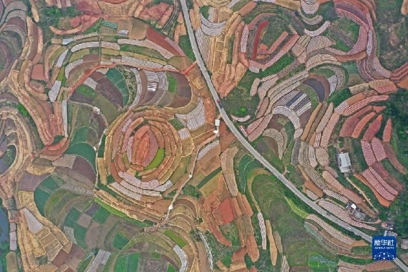 春回大地,廣西南寧市邕寧區(qū)蒲廟鎮(zhèn)縱橫交錯(cuò)的田地色彩斑斕,宛如色彩豐富的調(diào)色板(3月13日攝,無(wú)人機(jī)照片)。