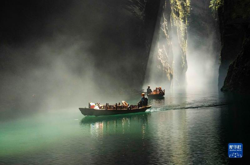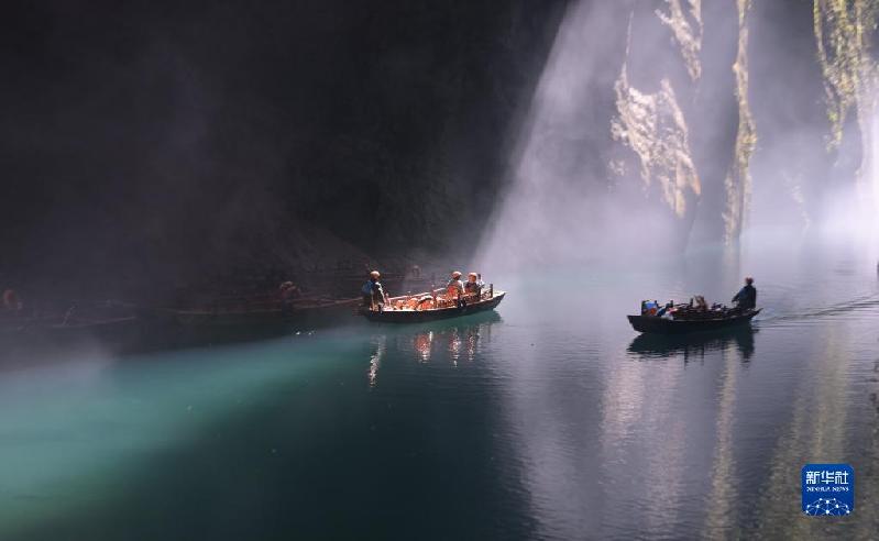 3月15日,游人在屏山村屏山旅游景區(qū)坐船通過霧中峽谷。