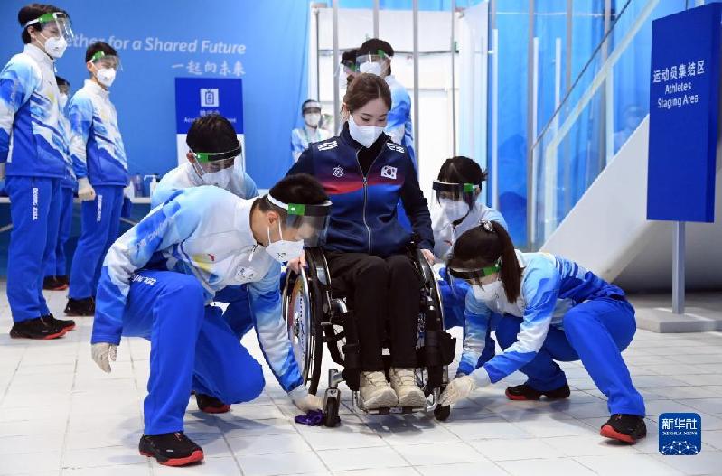 在國家游泳中心“冰立方”舉行的北京2022年冬殘奧會輪椅冰壺比賽前,志愿者們?yōu)轫n國選手白慧珍清潔輪椅(2022年3月6日攝)。