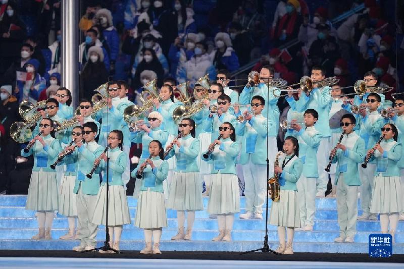 在北京2022年冬殘奧會開幕式上,重慶市特殊教育中心揚帆管樂團參演團隊演奏國際殘奧委會會歌(2022年3月4日攝)。