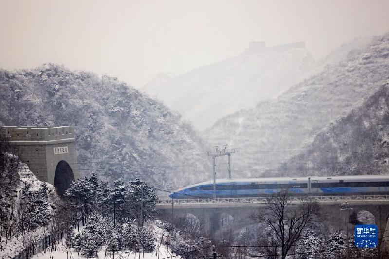 這是京張高鐵列車經(jīng)過居庸關(guān)隧道,從北京駛向太子城(2022年1月21日攝)。