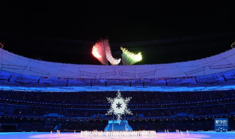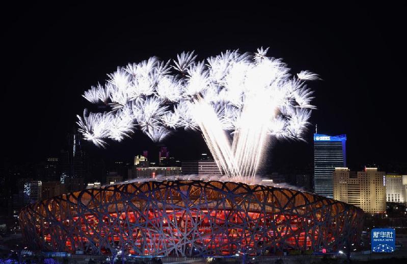 在第二十四屆冬季奧林匹克運動會開幕式上,焰火綻放在北京國家體育場上空(2022年2月4日攝)。