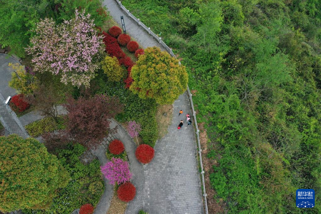 4月4日,在重慶市酉陽土家族苗族自治縣一“口袋公園”,居民在踏青賞景(無人機(jī)照片)。