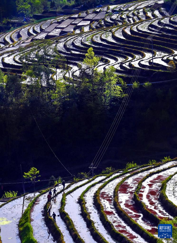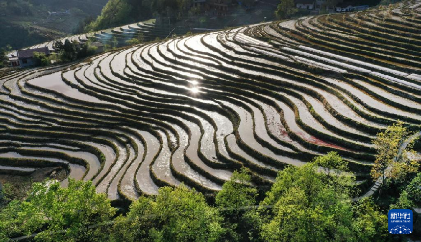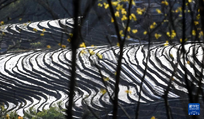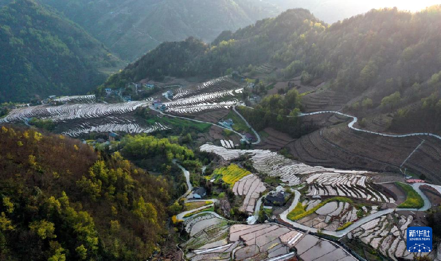 近日,在陜西省安康市嵐皋縣南宮山鎮(zhèn)桂花村,因春灌備耕,沿山勢自上而下層層鋪疊的千畝梯田,仿佛戴上了一串串銀鏈,構(gòu)成了一幅優(yōu)美的田園風(fēng)光圖。