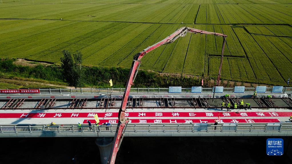 5月21日,在濟鄭高鐵山東長清黃河特大橋施工現(xiàn)場,中鐵上海局工作人員進行無砟軌道施工作業(yè)(無人機照片)。