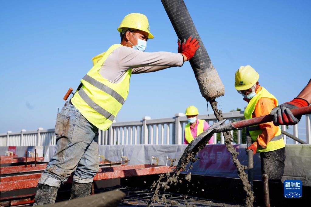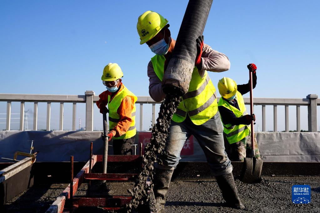 5月21日,在濟鄭高鐵山東長清黃河特大橋施工現(xiàn)場,中鐵上海局工作人員進行無砟軌道施工作業(yè)。