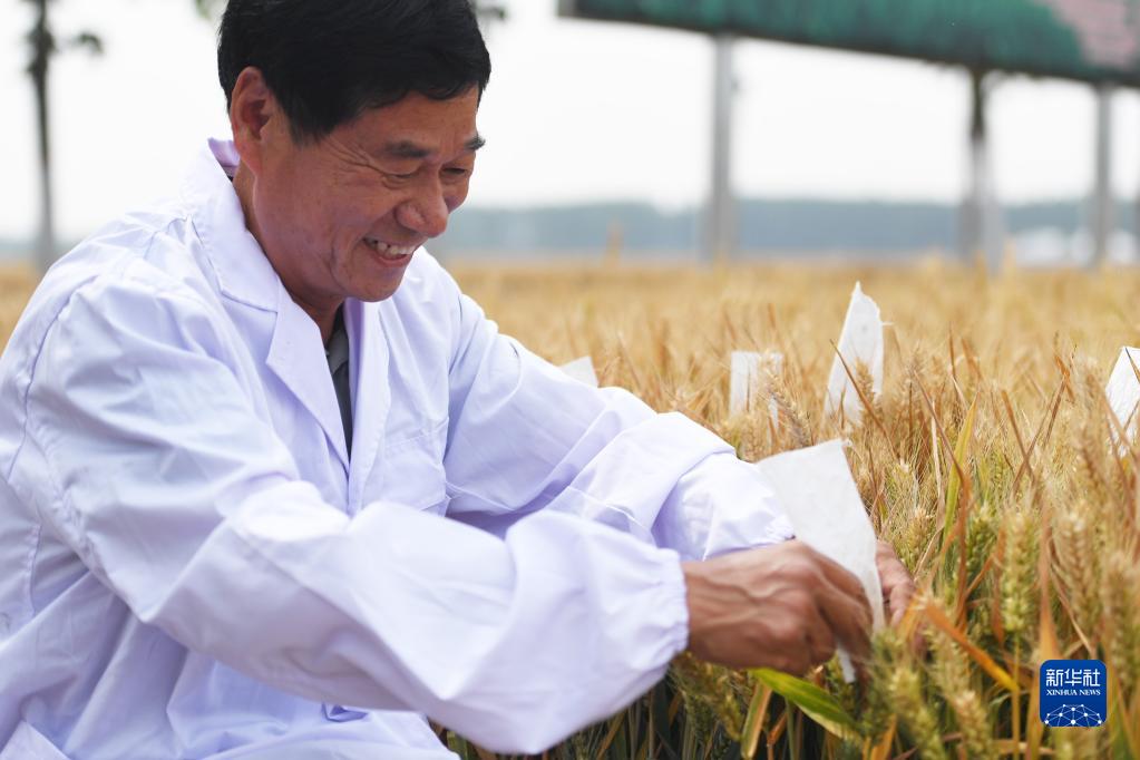 5月27日,在河南省駐馬店市西平縣二郎鎮(zhèn)張堯村高標(biāo)準(zhǔn)農(nóng)田示范區(qū)小麥試驗田,農(nóng)技專家陳振華在查看小麥長勢。