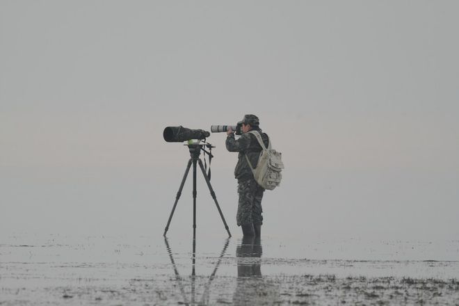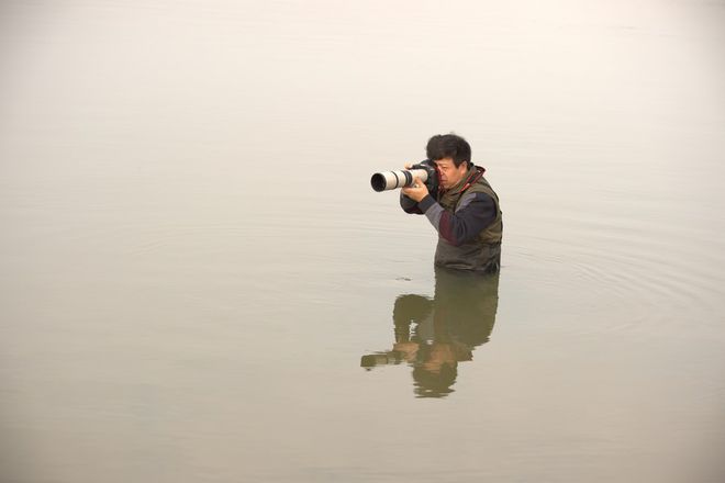 為了拍好長江江豚的照片,余會(huì)功會(huì)在中國最大淡水湖——鄱陽湖冰冷的湖水中連續(xù)站立幾個(gè)小時(shí)。(受訪者提供)