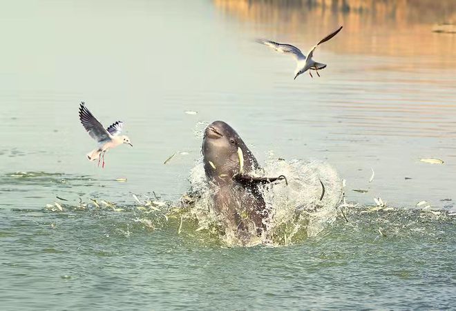 2021年,長江江豚被升級(jí)為國家一級(jí)保護(hù)動(dòng)物。雖然保護(hù)情況好轉(zhuǎn),余會(huì)功仍堅(jiān)守在守護(hù)江豚的戰(zhàn)線上。鄱陽湖上,不見了攔河網(wǎng)和漁船的蹤影,江豚從清澈的湖水中躍出,復(fù)而下沉覓食,余會(huì)功用相機(jī)記錄下這些喜人瞬間。