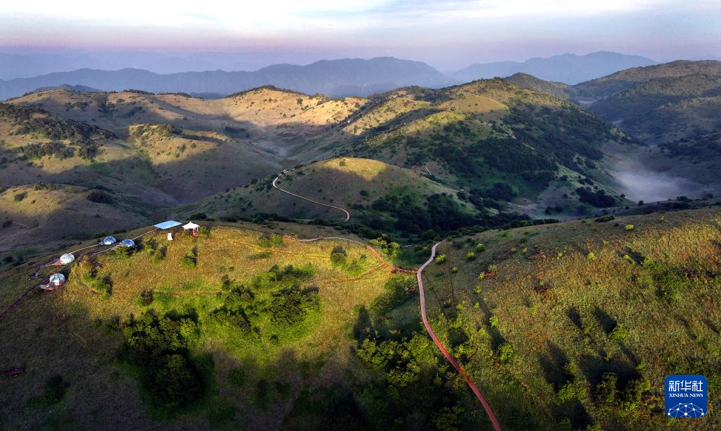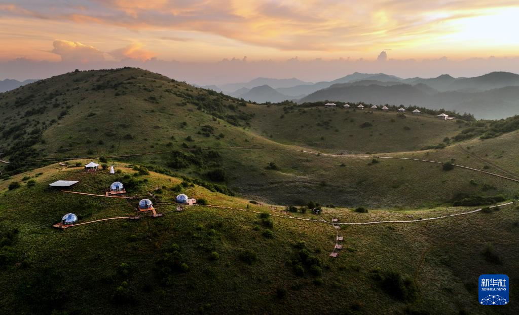 2022年7月14日,朝霞照耀著巴山大草原的露營(yíng)場(chǎng)地(無(wú)人機(jī)照片)。