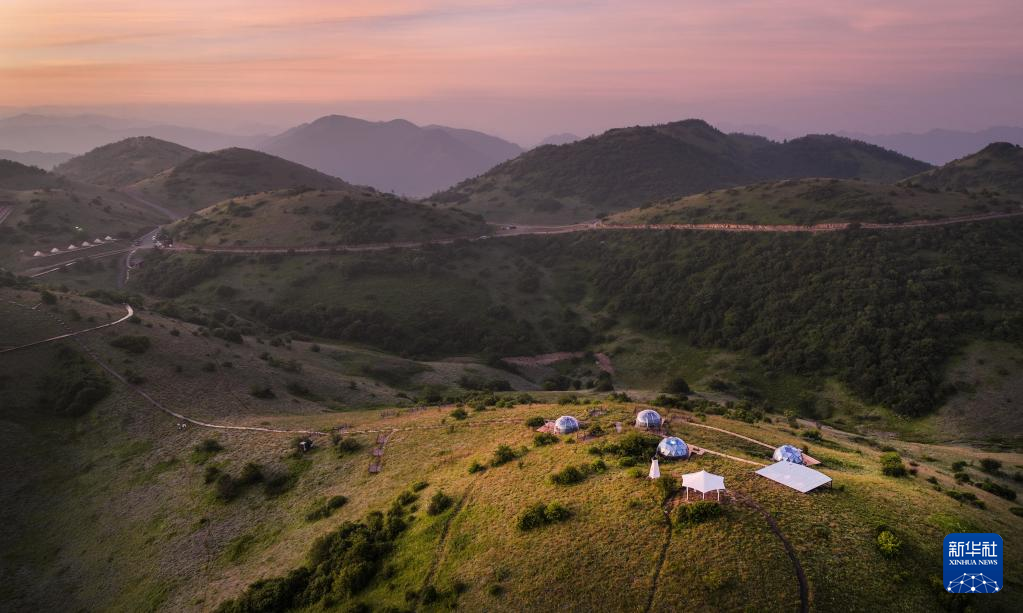 2022年7月14日,朝霞映紅了巴山大草原的露營(yíng)場(chǎng)地(無(wú)人機(jī)照片)。