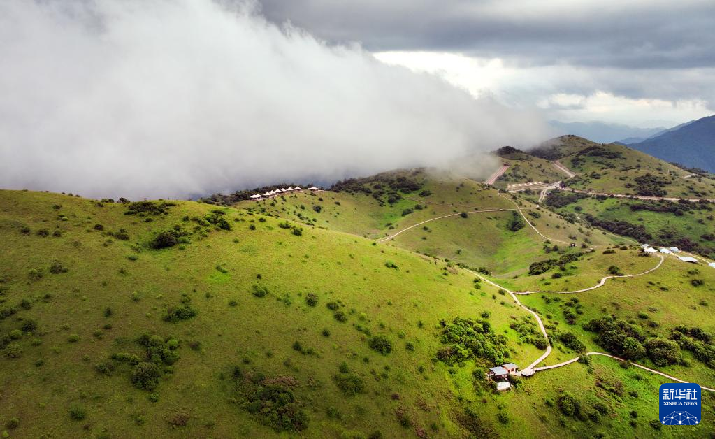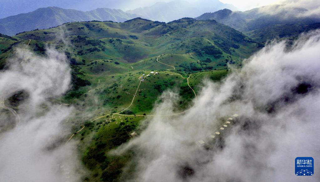 2022年7月13日拍攝的云霧縹緲中的巴山大草原(無(wú)人機(jī)照片)。