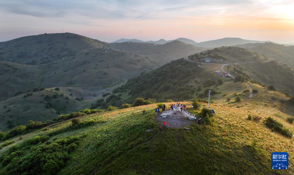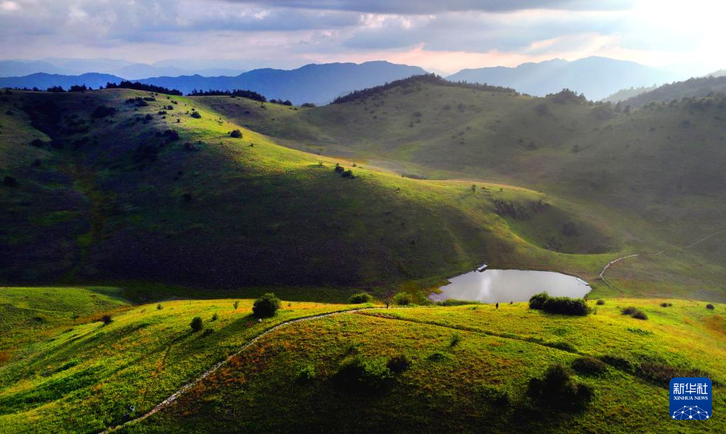 2022年7月13日拍攝的夕陽(yáng)下的巴山大草原(無(wú)人機(jī)照片)。