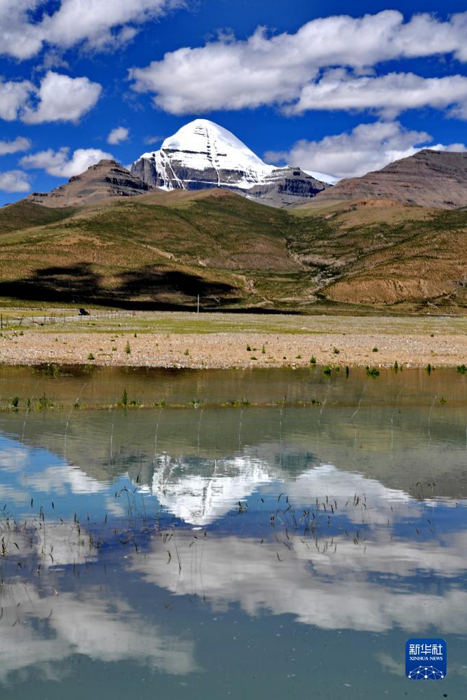 岡仁波齊峰倒映在水面(8月2日攝)。