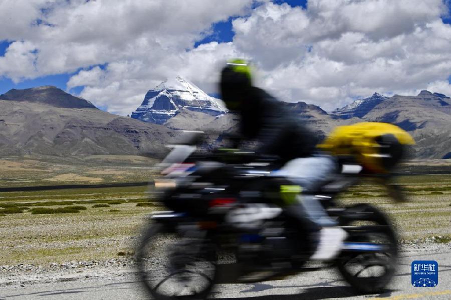 騎手駕駛摩托車(chē)經(jīng)過(guò)岡仁波齊景區(qū)(8月2日攝)。