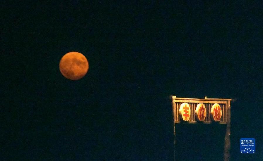 9月10日,一輪圓月從湖北武漢黃鶴樓后升起。