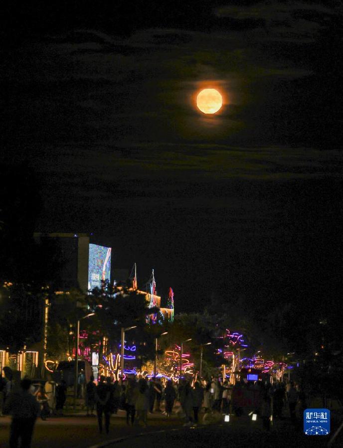 9月10日在河北省遵化市一處稻田畫景區(qū)拍攝的圓月。