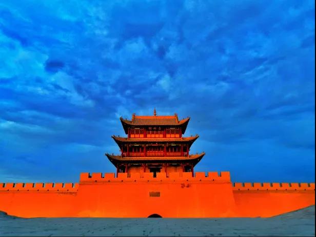 這張照片拍攝于嘉峪關,落日的余暉照射在嘉峪關城樓上,天空湛藍,瞬間使畫面的顏色飽和度很高,冷暖色的強烈對比,突出了天下雄關的偉岸和不容侵犯的氣勢。