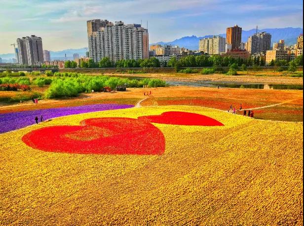 這張照片從較高的角度拍攝,從近處的花海到中間的城市建筑,再到遠處的大山,使畫面營造出較強的縱深感,表現(xiàn)出宏闊的城市美景。