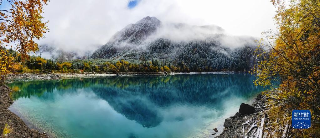 這是10月7日在世界自然遺產(chǎn)地九寨溝拍攝的雪后景色。
